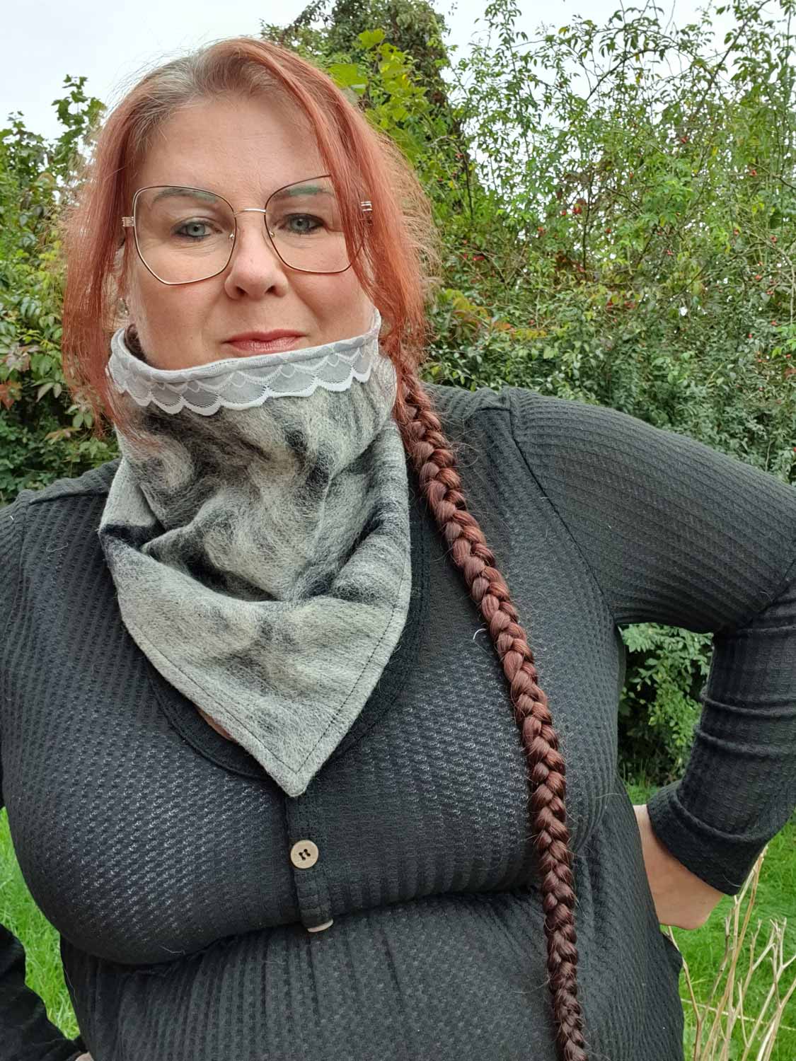 Manchmal muss es nicht poetisch sein, manchmal muss es einfach praktisch sein! Und das ist der asymmetrische Dreiecksloopschal „Vor Kälte geschützt“ auf jeden Fall. Besonders mit seinen 2 Höhen, bei der man die höhere Höhe auch gut einmal umschlagen kann. Und der Möglichkeit 2 Stoffe zu verwenden, um ihn so wenden zu können und somit 2 Schals in einem zu haben.