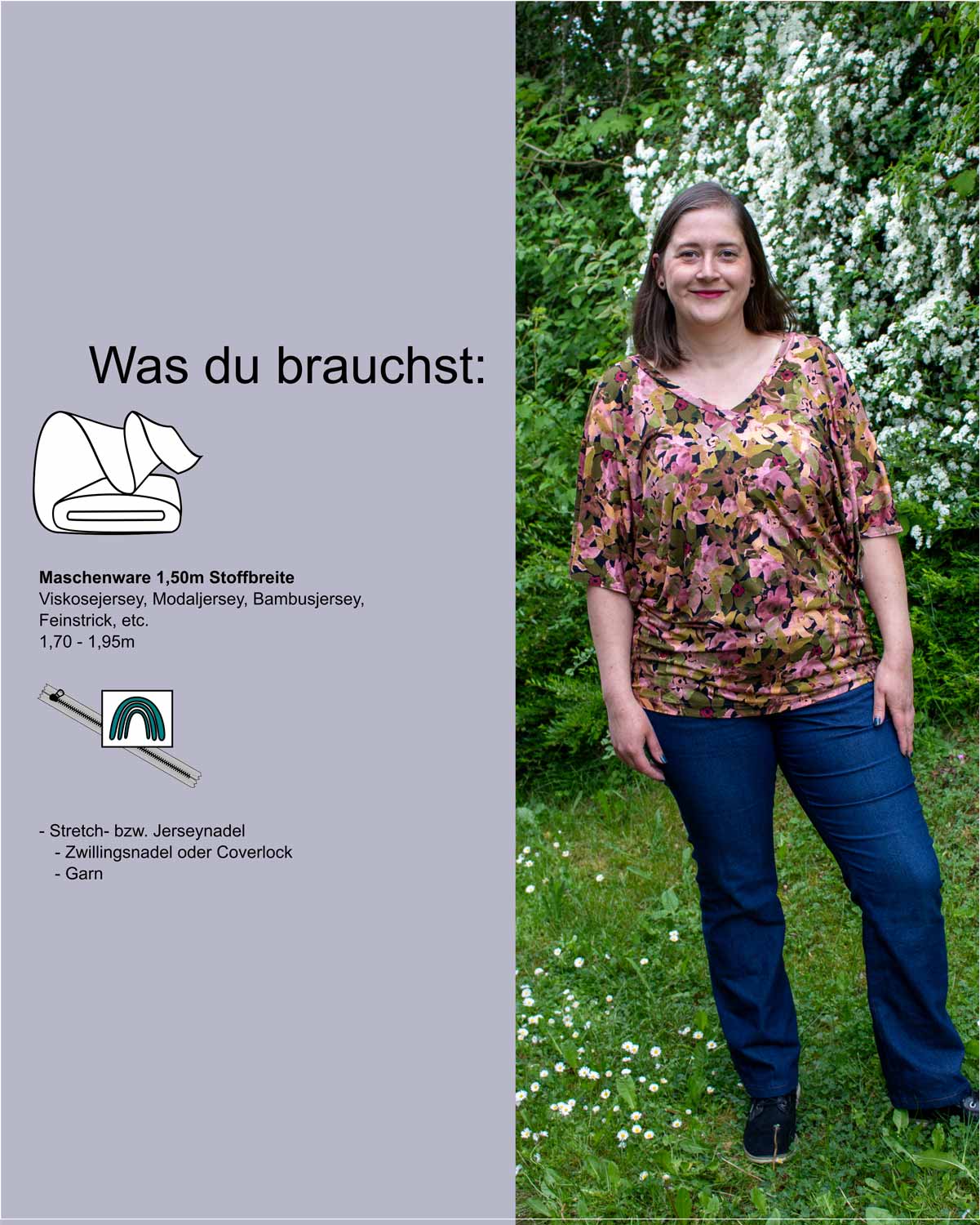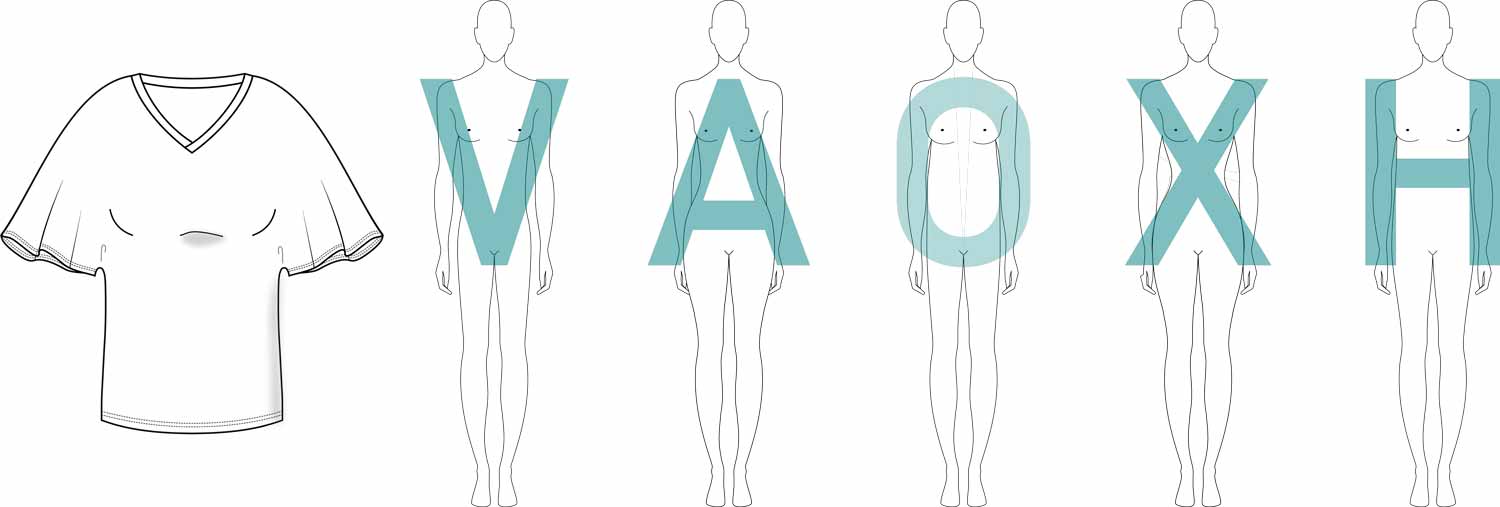 Dieser Schnitt bietet dir ein Fledermausshirt mit V-Ausschnitt und kurzen, weiten Ärmeln, etwas länger als hüftlang, so kannst du es wunderbar hochschoppen.